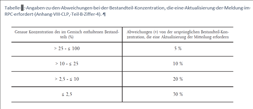 - Änderungen der Bestandteil-Konzentration gemäss den Vorgaben von Anhang VIII CLP, Teil B Ziffer 4 (Tab. 1).