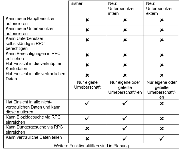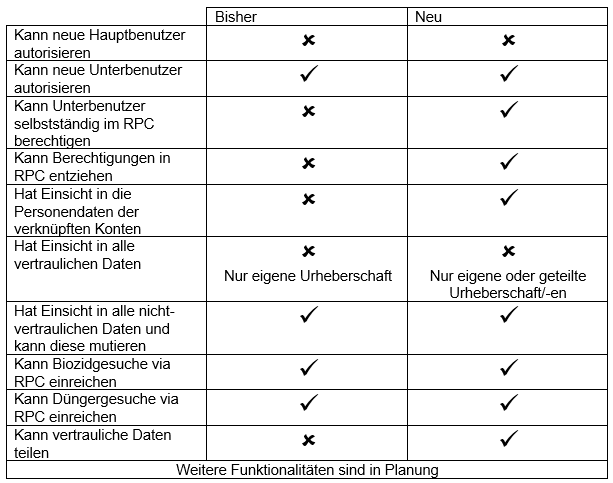 Im Zuge der Weiterentwicklung des Produkteregisters Chemikalien (RPC) werden mit der Version 4.7, welche voraussichtlich 2024 eingeführt wird, die Benutzertypen und deren Rollen inkl. Berechtigungen automatisiert, erweitert und teilweise delegiert. Die Kontoerstellung und deren Betreuung wird dann fast vollständig im Produkteregister Chemikalien (RPC) stattfinden.