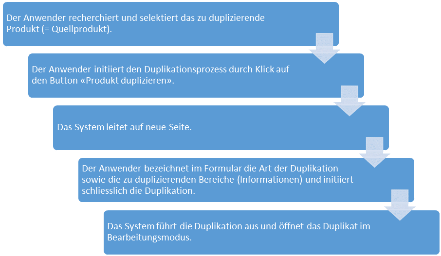 Das Ziel der Funktion ist es den Arbeitsaufwand für Melder zu reduzieren. Mit dieser neuen Funktion sollte es den Meldern möglich sein gleiche oder ähnliche Produkte möglichst ohne Zeitaufwand in RPC zu duplizieren. Innerhalb von RPC wurde für diesen Zweck ein neuer Button „Produkt duplizieren“ erstellt, welcher es den Benutzern der Firmen ermöglicht ein schon bestehendes Produkt in wenigen Schritten zu duplizieren.