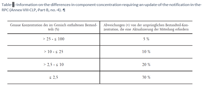 - changes to the concentration of components according to the provisions of Annex VIII CLP, Part B no. 4 (Tab. 1).