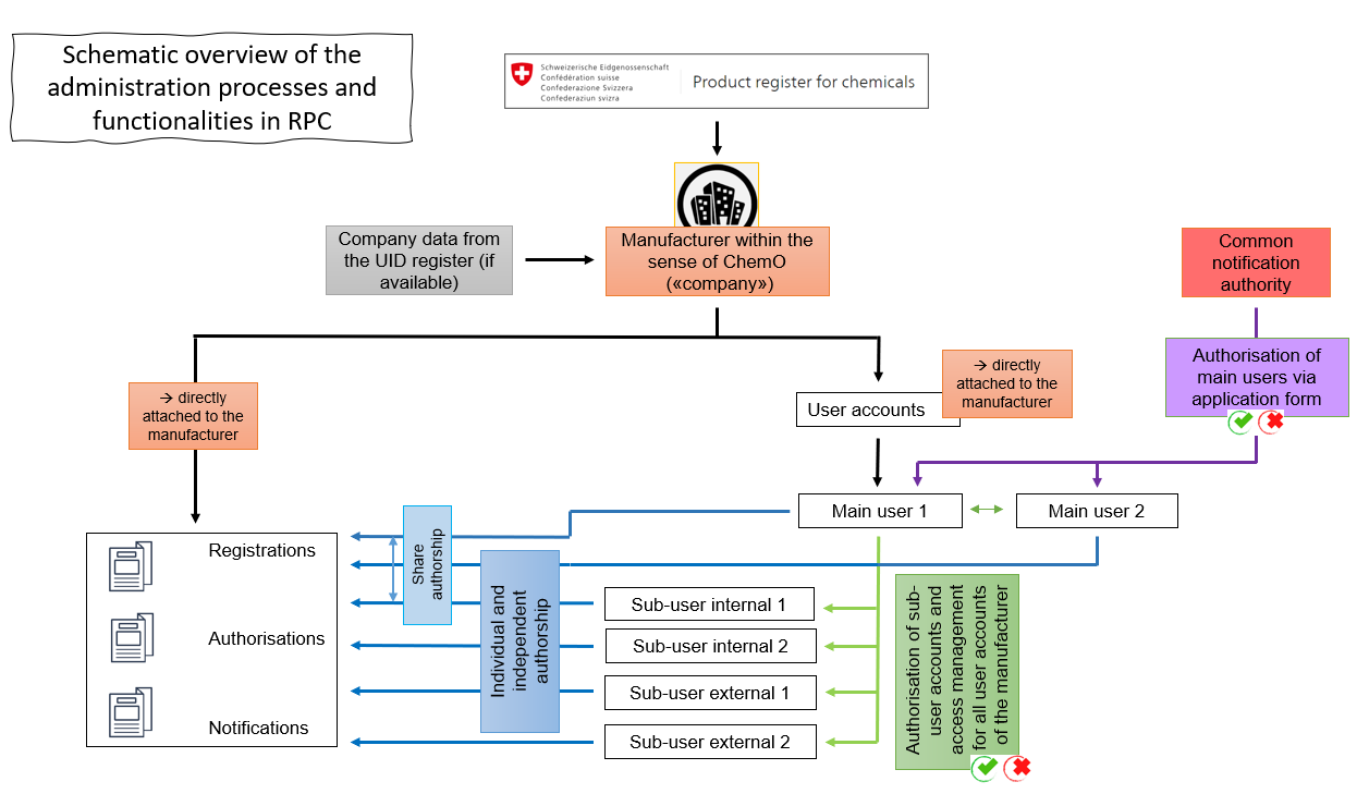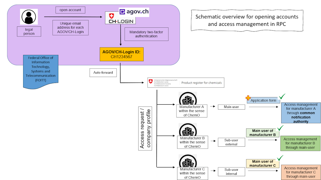 With the help of graphical representations, you can learn how the RPC is linked to the CH login accounts in the background and which hierarchical principle it follows.
