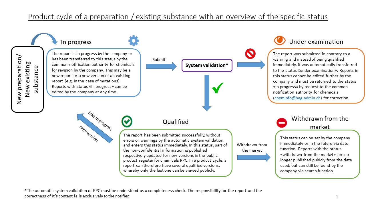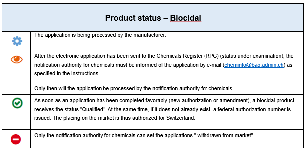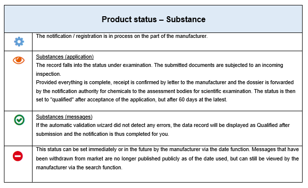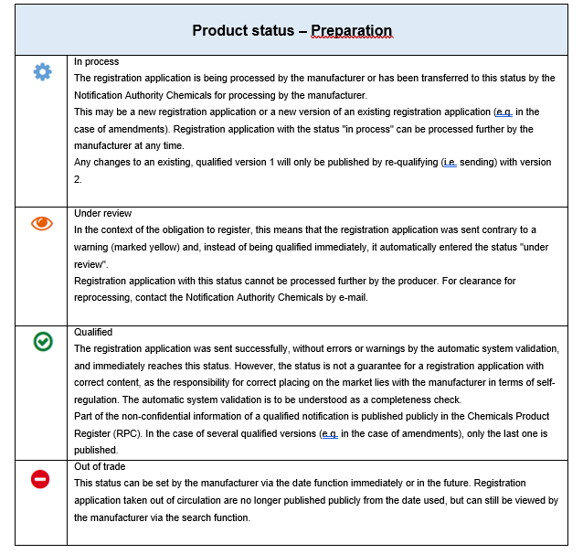 In the authorised area of the product register for chemicals the logged-in users/notifiers can see the status of all of their own «products» in the product search.