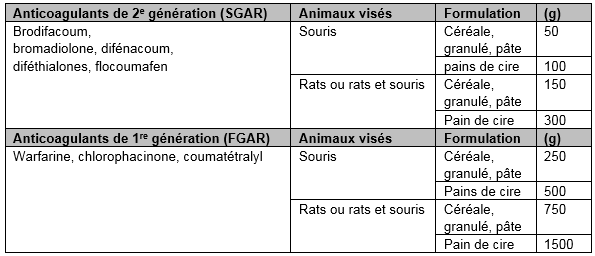 La plupart des rodenticides disponibles sur le marché en tant qu’appâts contiennent une substance active anticoagulant. Ces substances actives sont appelées anticoagulant. Du fait de leur bonne efficacité, on utilise en premier lieu des anticoagulants de deuxième génération (second-generation anticoagulant rodenticides, SGAR ; bromadiolone, difénacoum, brodifacoum, flocoumafen et diféthialone). En général, une seule absorption d’appât suffit pour tuer les rongeurs. Dans le cas des rodenticides contenant des anticoagulantsde première génération (first-generation anticoagulant rodenticides, FGAR ; warfarine, chlorophacinone, coumatétralyl), plusieurs absorptions d’appât sont nécessaires.