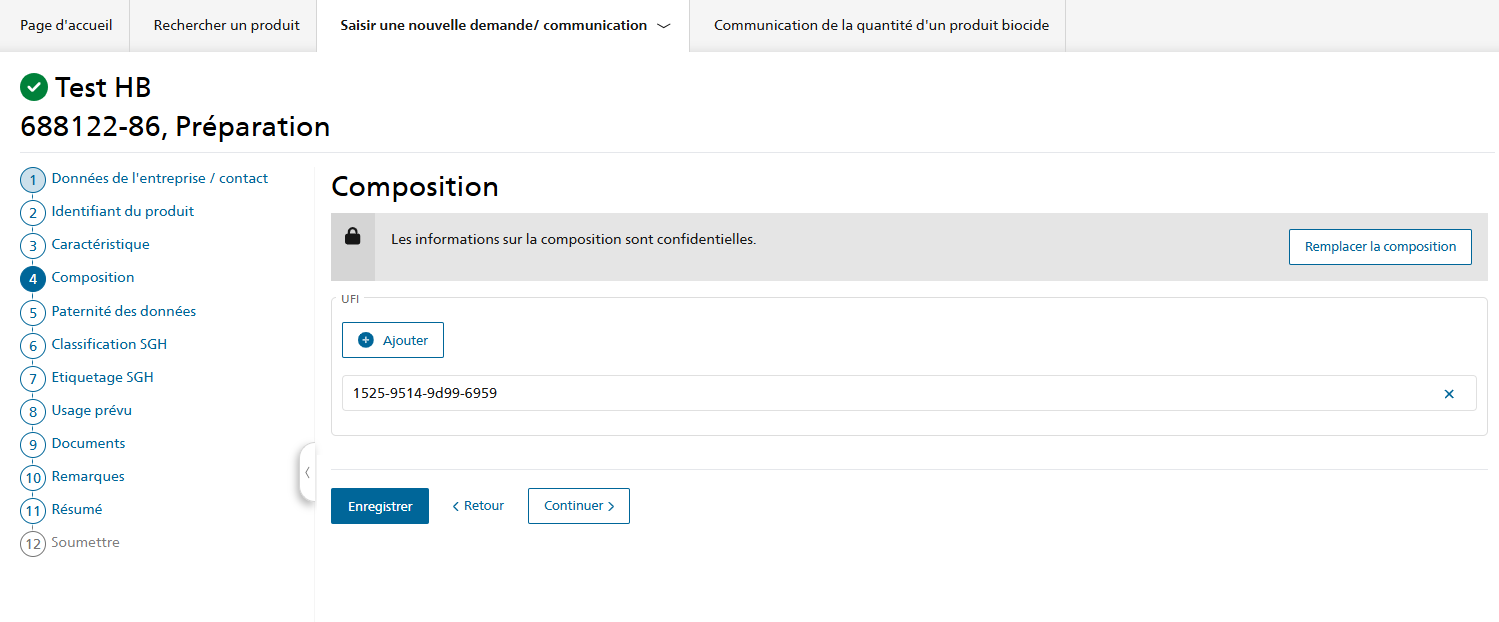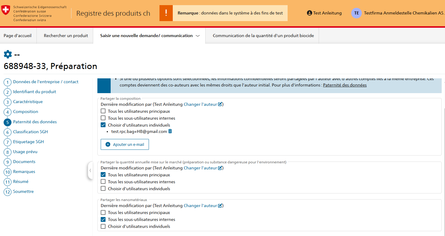 Uniquement en tant qu'auteur des informations confidentielles, ce qui inclut également les comptes d'utilisateurs avec lesquels vous partagez une paternité, vous trouverez pour chaque type de notification (préparations, biocides, substances, etc.) la section « Paternité ».