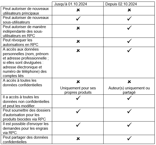 L'utilisateur principal dispose de droits d'administration étendus au sein du RPC. Contrairement aux sous-utilisateurs, il peut, pour l'entreprise communiquante: