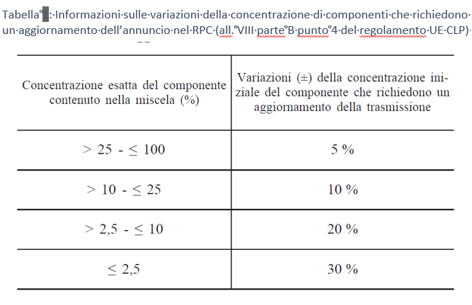 - modifiche della concentrazione di componenti conformemente alle prescrizioni dell’allegato VIII parte B punto 4 del regolamento UE CLP (tab. 1).