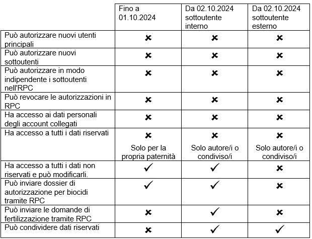Con la pubblicazione (Release Note) della versione 4.7 di RPC, la gestione degli utenti è stata aggiornata. Il ruolo di sotto-utente è stato migrato alla nuova versione e le sue autorizzazioni sono state adattate come segue: