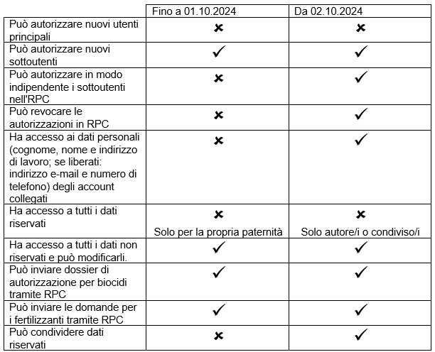 Con la pubblicazione (Release Note) della versione 4.7 di RPC, la gestione degli utenti è stata aggiornata. Il ruolo dell'utente principale è stato migrato alla nuova versione e le sue autorizzazioni sono state adattate come segue: