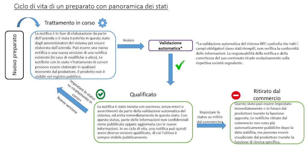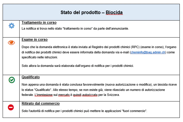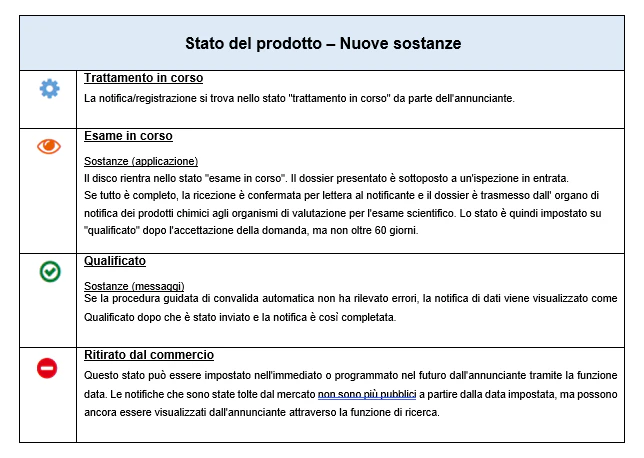Nell’area autorizzata del registro dei prodotti chimici tutti i prodotti visualizzabili dall’utente autorizzato/annunciante sono dotati di uno stato.